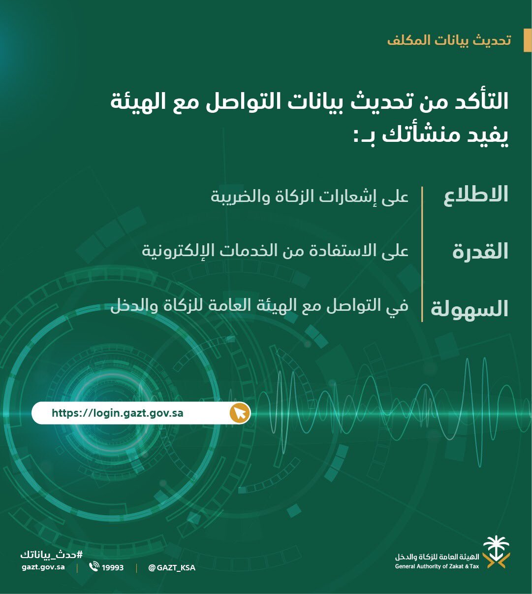 الهيئة العامة للزكاة والدخل On Twitter تأكد من تحديث بيانات التواصل لمنشأتك لتكون على اطلاع دائم بأحدث الخدمات والإشعارات الخاصة بالهيئة حدث بياناتك