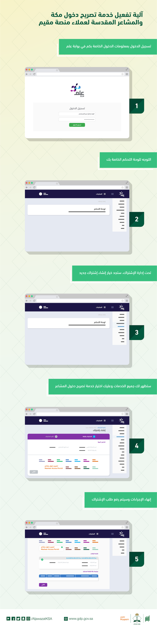 وقال العميد الشويرخ في تصريح صحفي اليوم إنه بالإشارة للأنظمة والتعليمات المنظمة لإدارة حركة المرور وعمليات نقل الحجاج في مكة المكرمة والمشاعر المقدسة ي منع دخول المركبات الصغيرة التي تحمل لوحات غير سعودية وتقل. أعلنت المديرية العامة للجوازات أنه بإمكان الشركات والمؤسسات الغير مسجلة بمنصة مقيم الإلكترونية التسجيل بخدمة تصريح دخول مكة والمشاعر المقدسة. وأضافت الجوازات أن ذلك يأتي تيسيرا لإصدار تصاريح الدخول الخاصة.