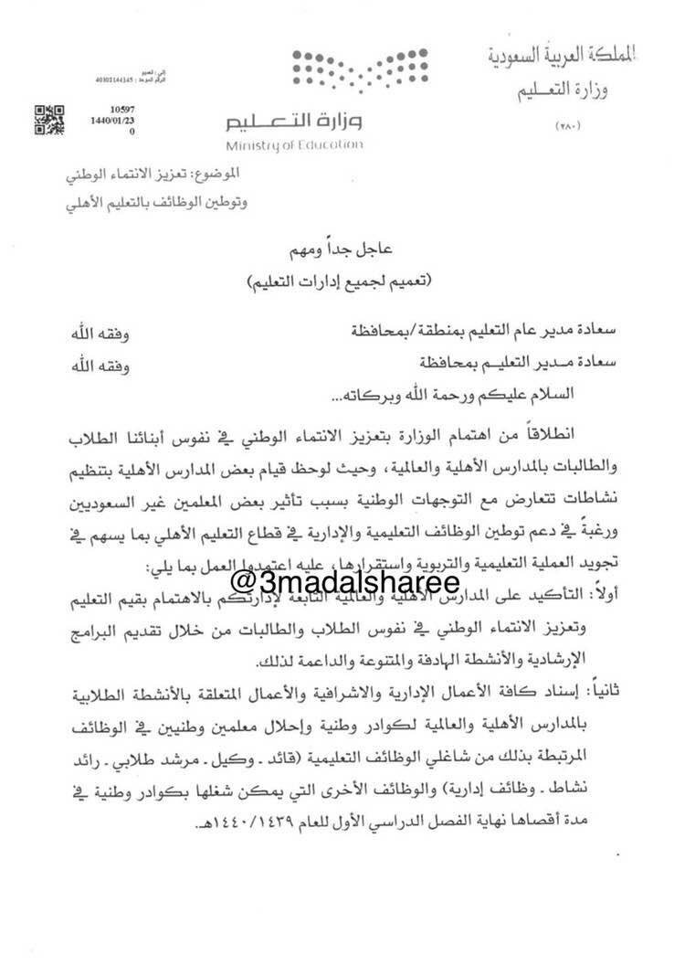 محمد الزارع On Twitter تعميم الوزير أكد على توطين الوظائف التعليمية قبل نهاية الفصل الدراسي الأول وتشكيل فرق إشرافية لمتابعة التزام المدارس الأهلية والعالمية واتخاذ الإجراءات النظامية بحق المدارس غير الملتزمة ومراجعة