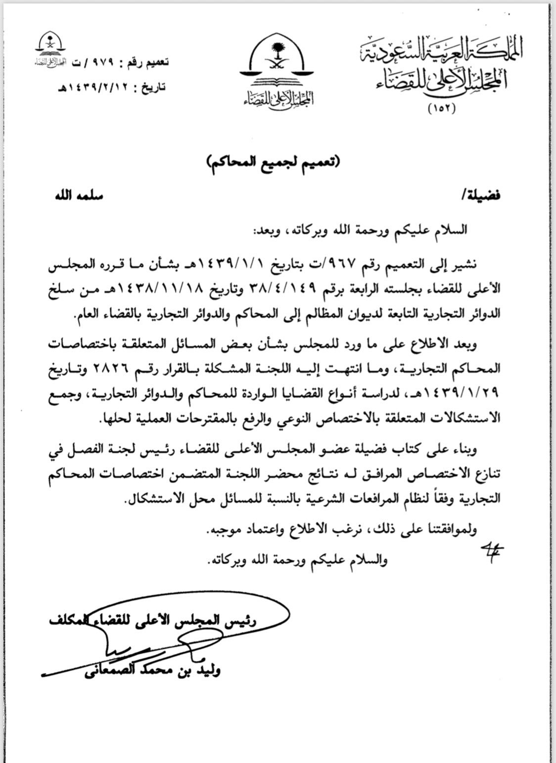 مختارات عدلية A Twitteren تعميم رقم ٩٧٩ ت وتاريخ ١٤٣٩ ٢ ١٢هـ والصادر من المجلس الاعلى للقضاء بشأن الاختصاص النوعي للمحاكم والدوائر التجارية هام لكل من له علاقة بالقضاء التجاري ودائما