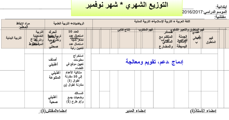 التوزيع الشهري لشهر نوفمبر للسنة الاولى ابتدائي الجيل الثاني