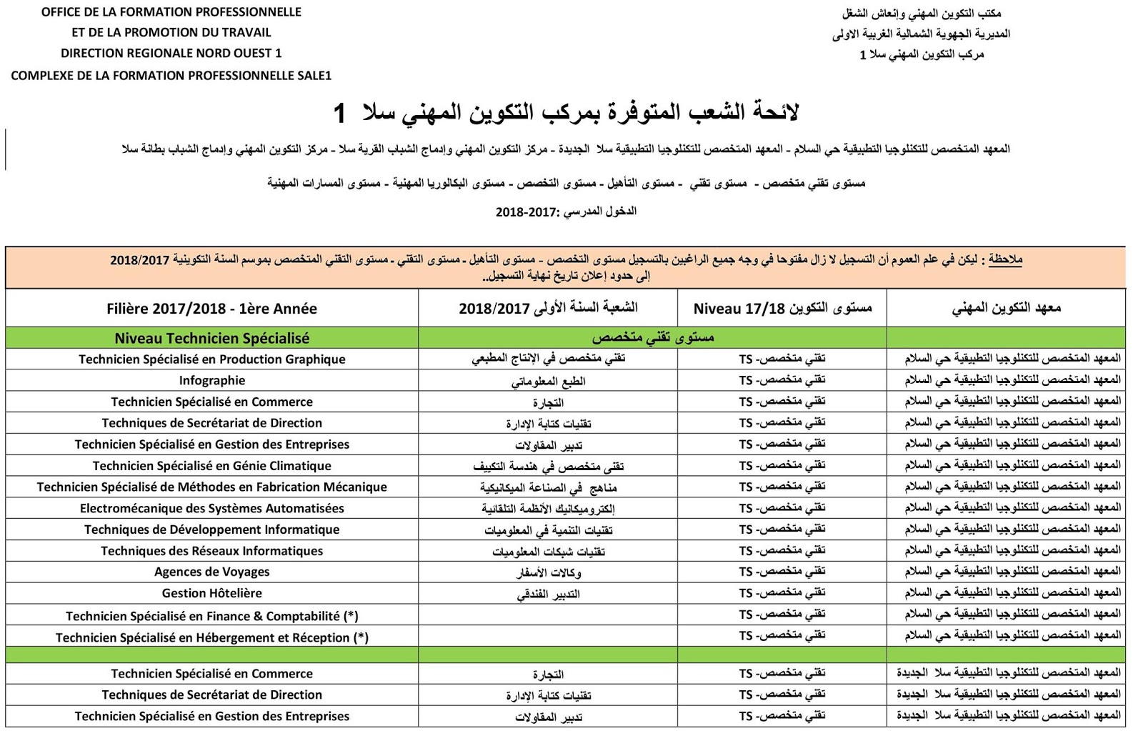 لائحة الشعب المتوفرة بمركب التكوين المهني بسلا