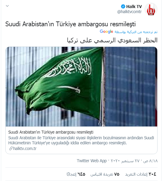 فرويد On Twitter وسائل إعلام تركية تقول أن السعودية قررت حظر دخول المنتجات التركية للمملكة بشكل رسمي القرار سيدخل حيز التنفيذ في أكتوبر القادم أي منتج أو بضاعة مكتوب فيها صنع
