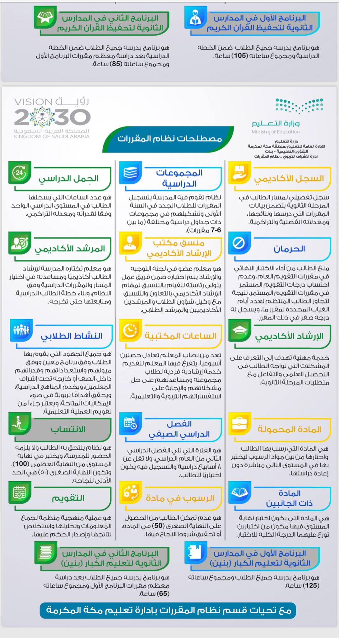 دليل التعليم الثانوي نظام المقررات. تم اعتماد تطبيق دليل نظام المقررات للمرحلة الثانوية والذي سيطبق مع بداية العام الدراسي1440 1439هـ حيث سيطبق الإصدار الأول من الدليل الذي تقرر أن يبدأ العمل به في جميع المدارس الثانوية ومدارس تحفيظ القرآن الكريم. دليل التعليم الثانوي نظام مقررات الاصدار الاول للتحميل المباشر المجاني لكل من يرغب في الحصول عليها بسهولة ويسر لكل من يعمل في مجال التعليم. دليل نظام المقررات الجديد للمرحلة الثانوية ١٤٤٠ كشاف الخطة الدراسية المقترحة لنظام المقررات حسب المنهج الجديد ١٤٣٩ ١٤٤٠ خطة دراسية نظام المقررات pdf التعليم الثانوي 2019.