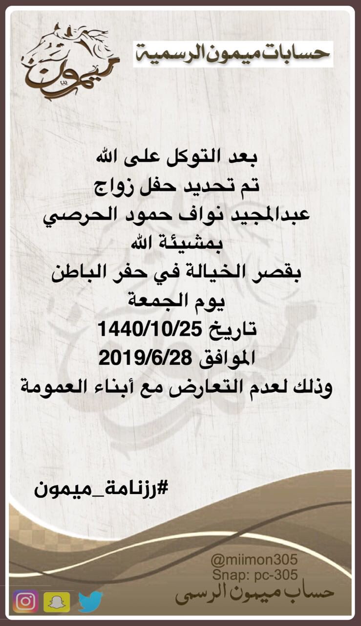 O Xrhsths حساب ميمون الرسمي Sto Twitter بعد التوكل على الله تم تحديد حفل زواج عبدالمجيد نواف حمود الحرصي الميموني بمشيئة الله بقصر الخيالة في حفر الباطن يوم الجمعة تاريخ 1440 10 25 هـ الموافق
